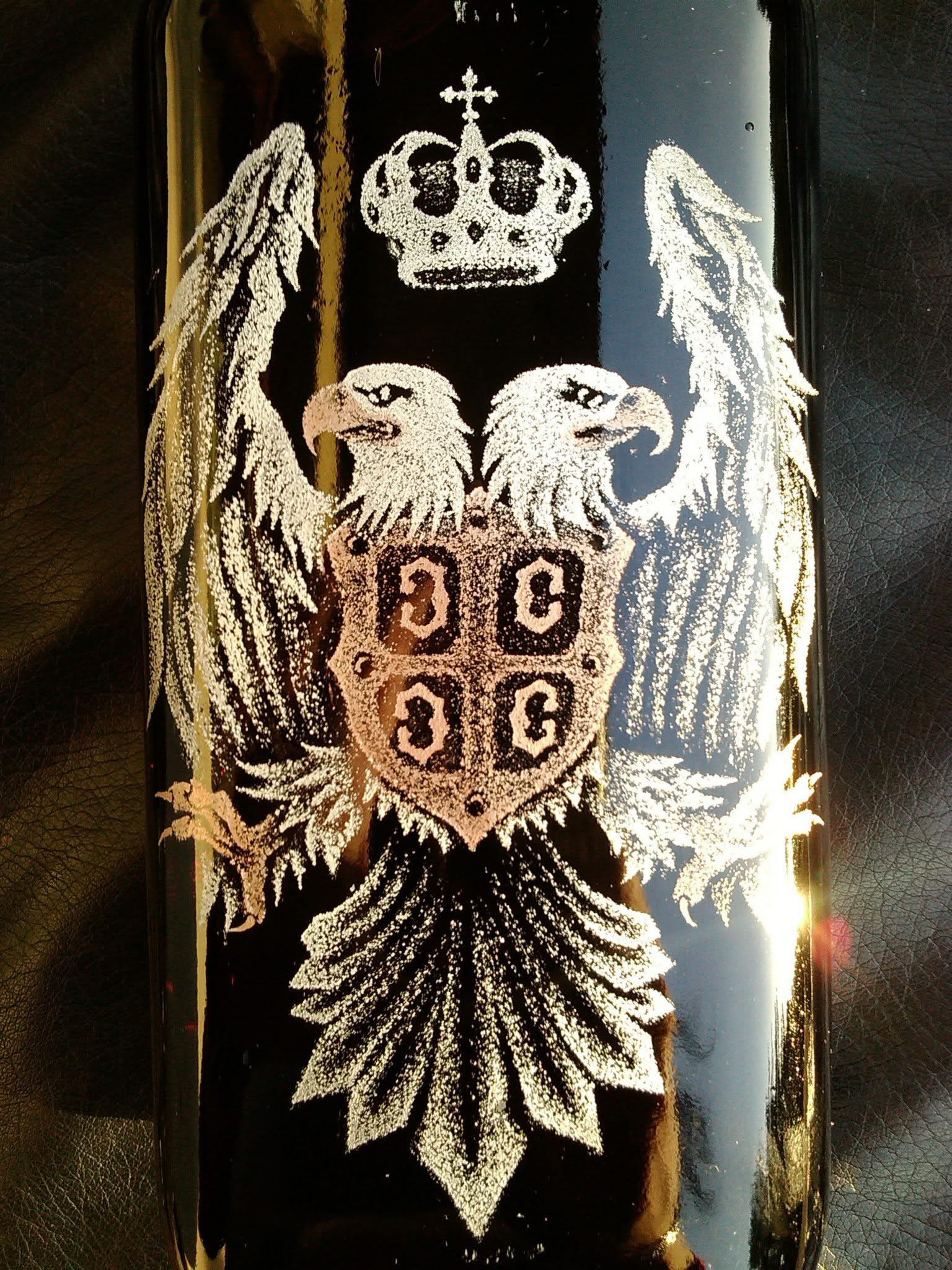 - hand (stipple) engraved glass bottle, silver and copper powder